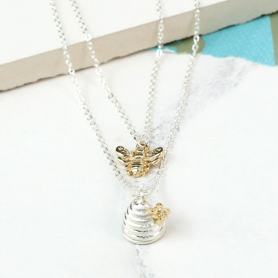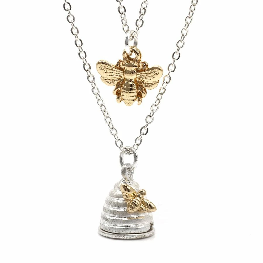 Gorgeous double layer silver plated necklace with a golden bee and a silver plated beehive charm.