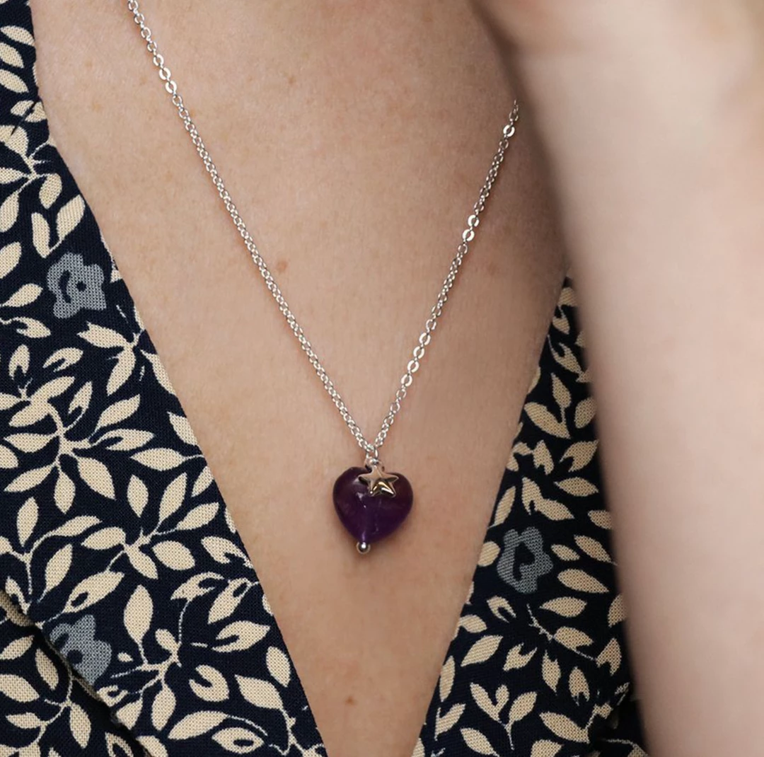 Silver plated fine chain necklace with an amethyst heart shaped stone and single silver star charm. Fastened with a lobster clasp with an extension chain to adjust the length.