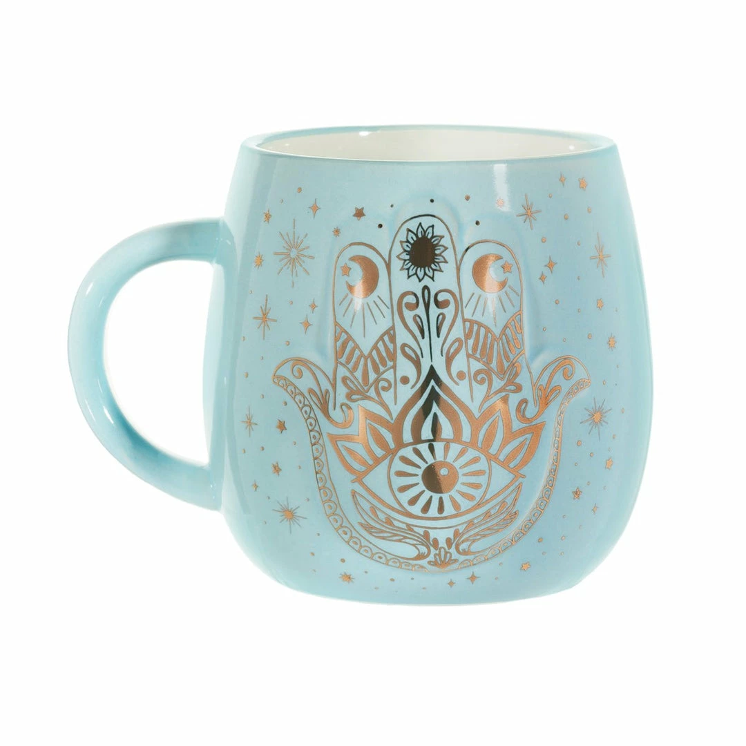 - With a gorgeous moon and star design, this stoneware mug features a Hamsa hand with a duck egg background with gold accents.
