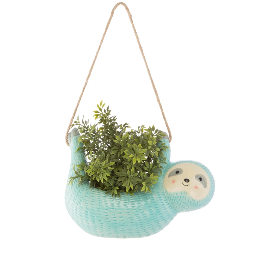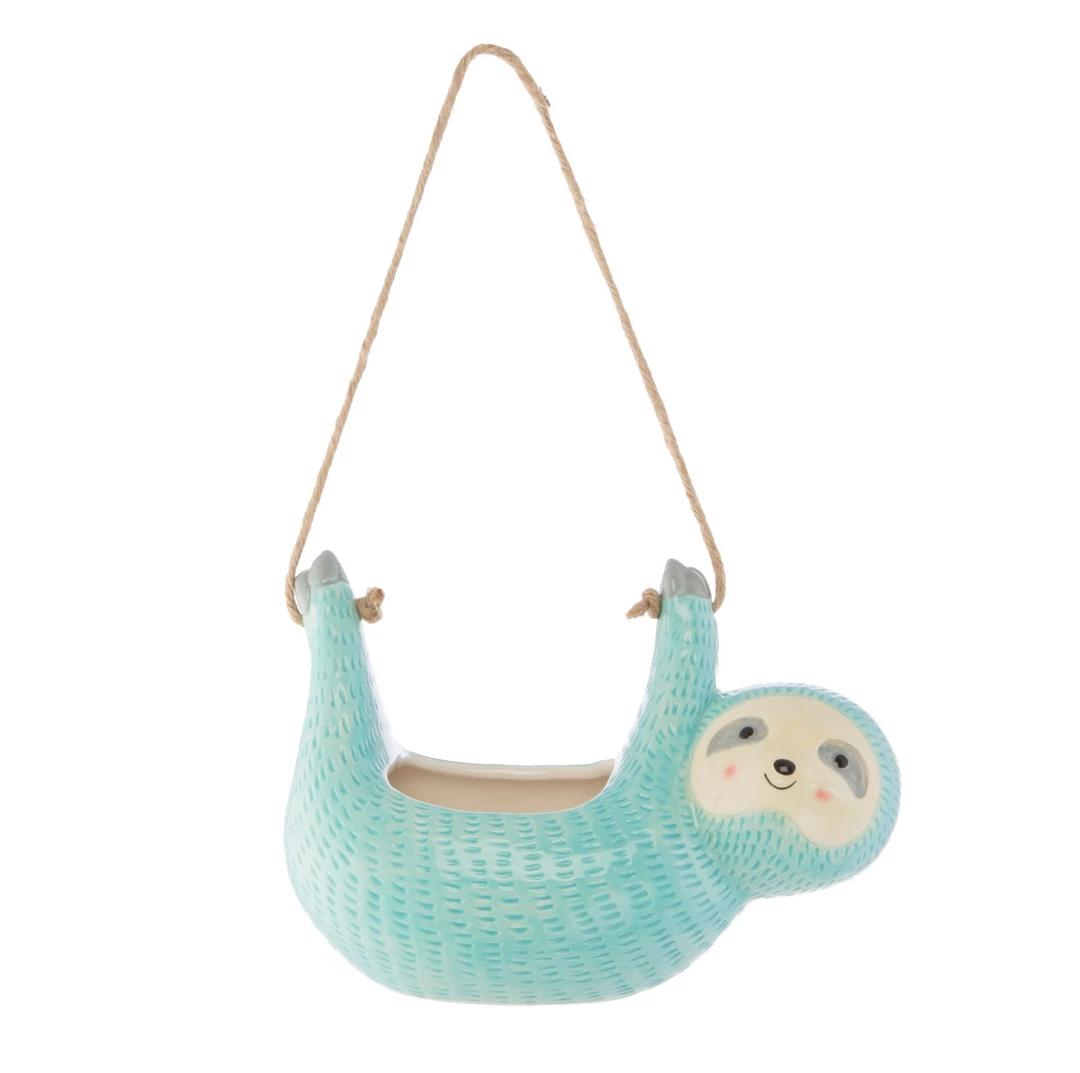 This cool turquoise blue hanging planter is a charming and calming addition to the home. Shaped as a Sloth, with a shabby chic string to hang it in the perfect spot.