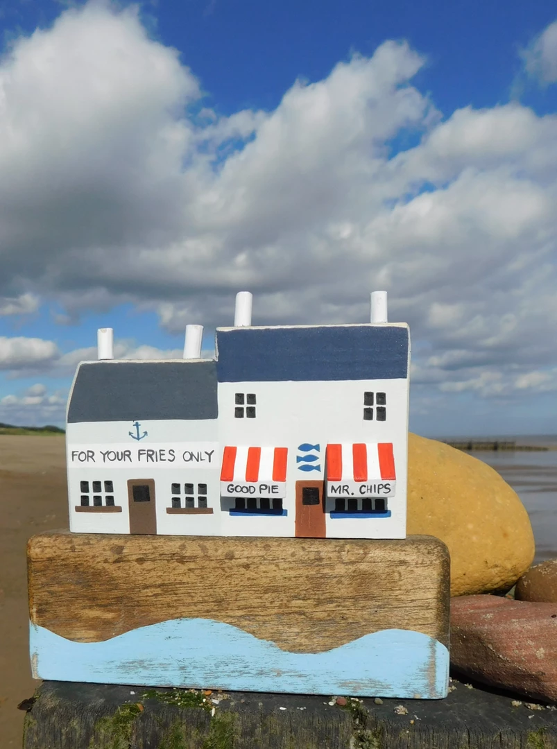 A fun rustic scene with two seaside shops with a metal awning over the chip shop.