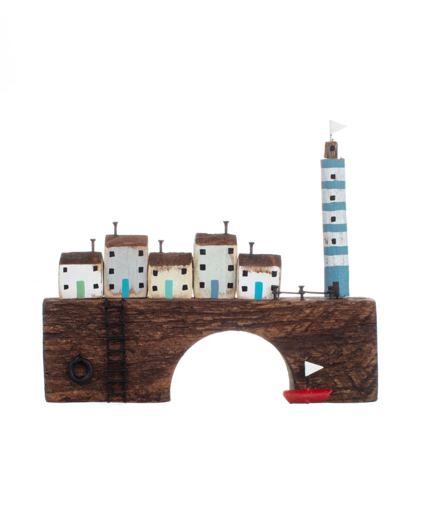 Quirky little ornament of a lighthouse above a bridge next to a row of coastal cottages.