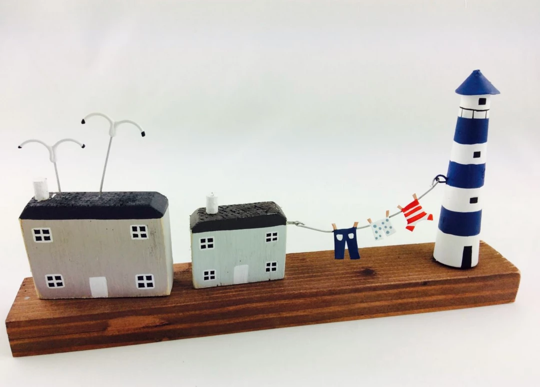 A lovely rustic scene with two harbour houses with seagulls and a lighthouse with a washing line.