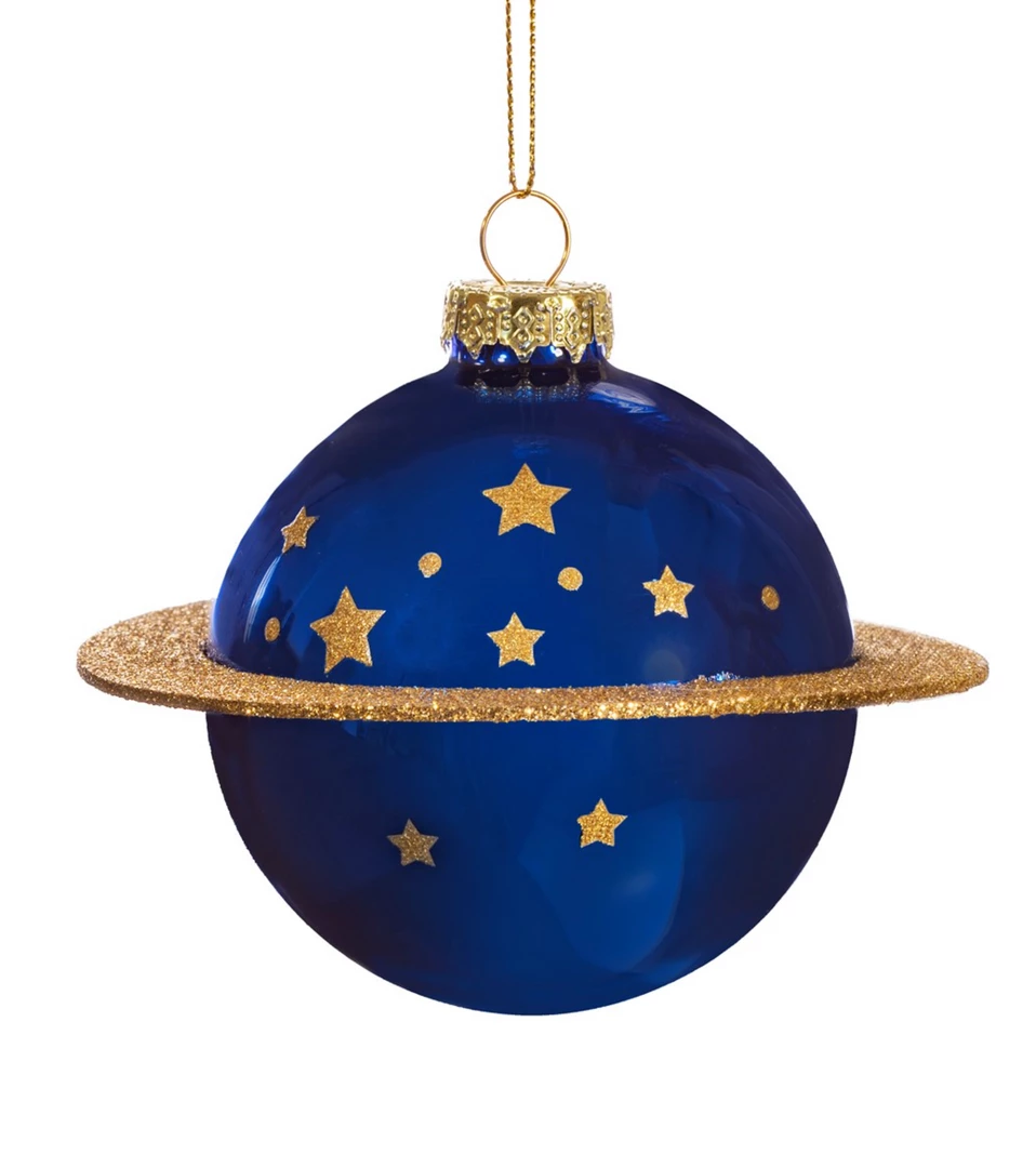 Channel your inner spaceman (or woman!) with this gorgeous metallic navy blue glass bauble planet with golden stars and ring. It’s out of this world!