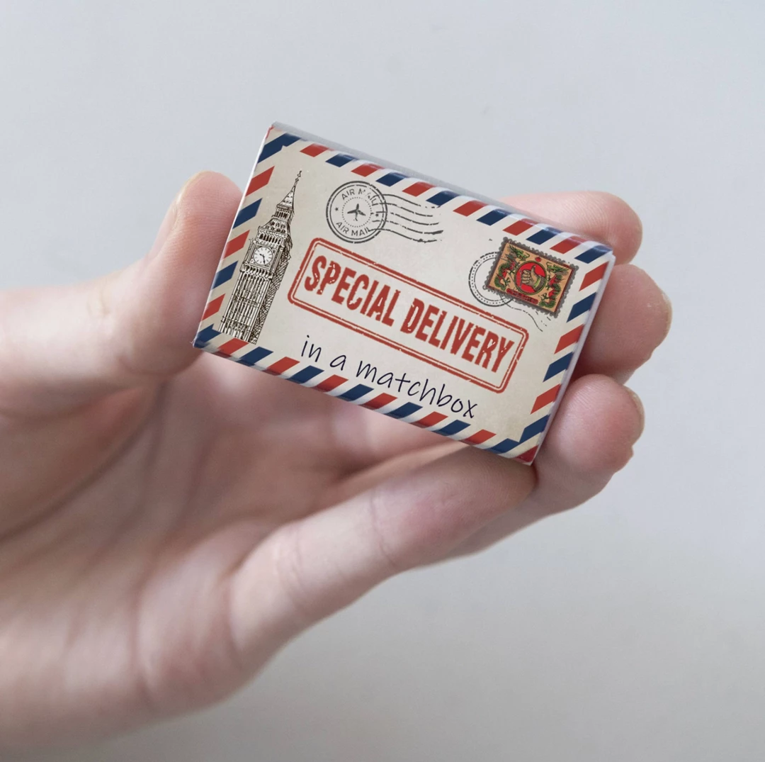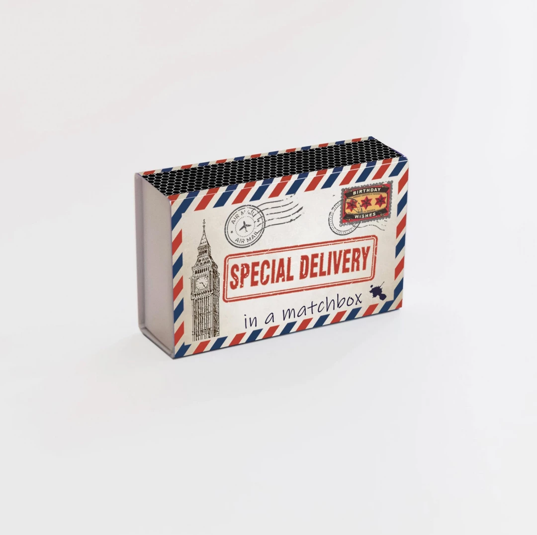 A unique take on a traditional birthday gift – a miniature bouquet of cream roses in a matchbox. This delightful bunch of flowers is presented in a matchbox with a vintage special delivery design. On opening the matchbox the recipient will be presented with an exquisite bunch of handmade paper cream roses in a tiny paper bouquet, and the message ‘Happy Birthday’. A truly unique keepsake gift, Special Delivery In A Matchbox is the perfect way to wish them Happy Birthday.