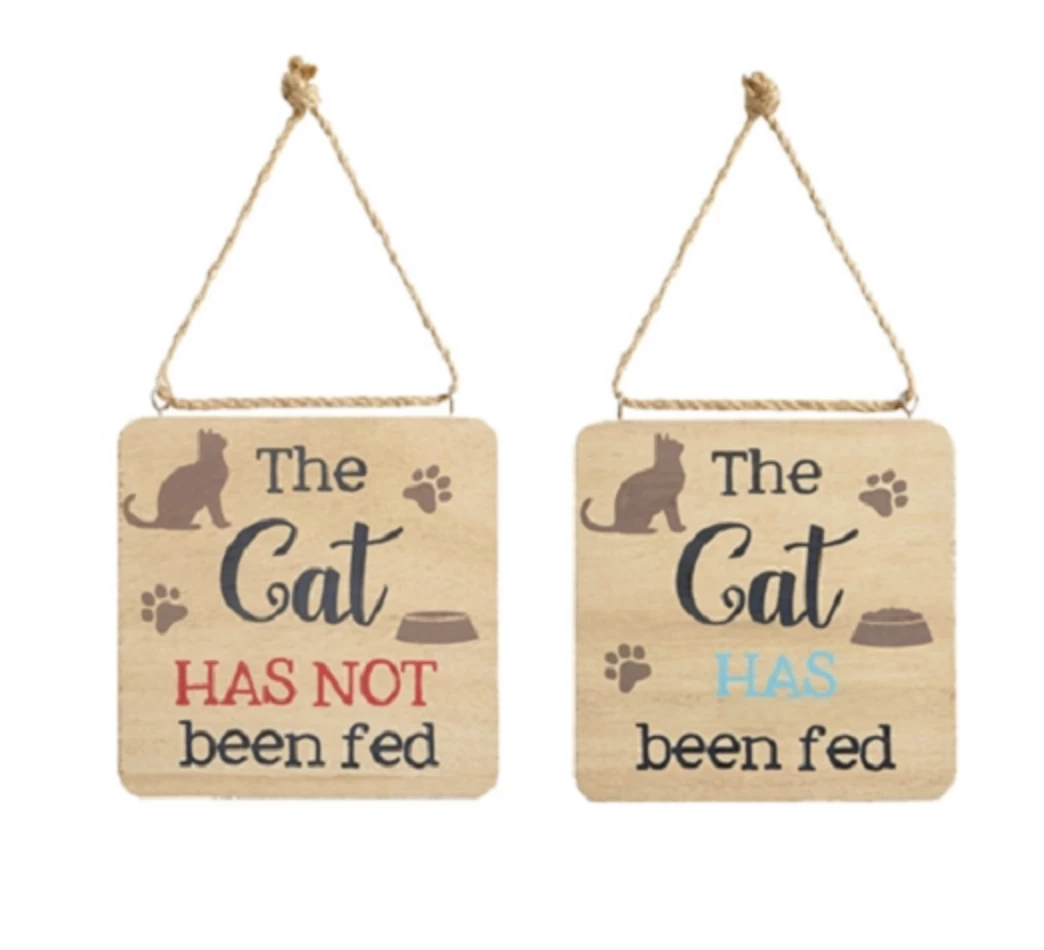 Wooden two sided sign with a rope hanger which has the message “The Cat Has Been Fed” on one side and “The cat has not been fed” on the other.