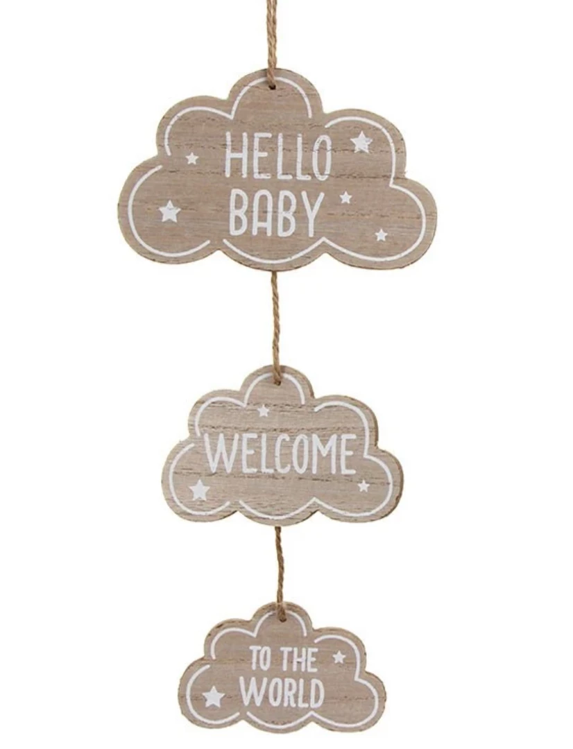 A lovely wooden hanging set of three clouds with the message “Hello Baby, Welcome, To The World”. They are connected with a natural jute string for hanging in a new baby’s room.