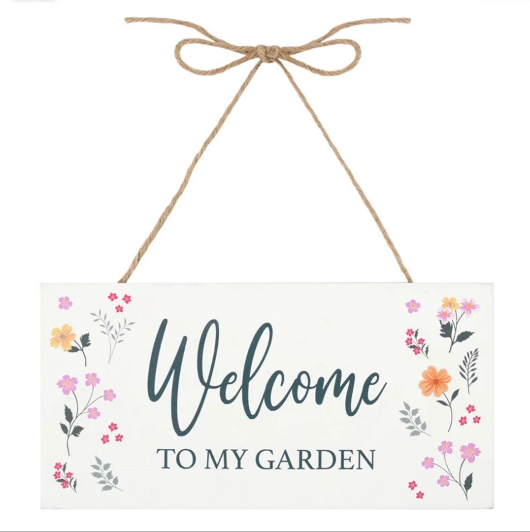 A wooden painted sign with pretty delicate flowers and the words “Welcome to My Garden”