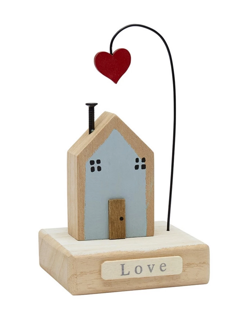 A cute little wooden house with a red heart above with the word “Love” on the base. This would make a perfect new home gift or to send to someone you love.