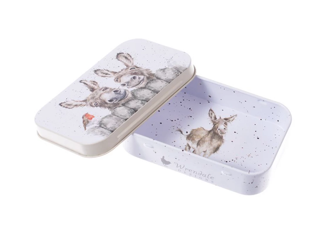 Perfect for storing trinkets, pills or anything small, this mini tin features an adorable donkey design.