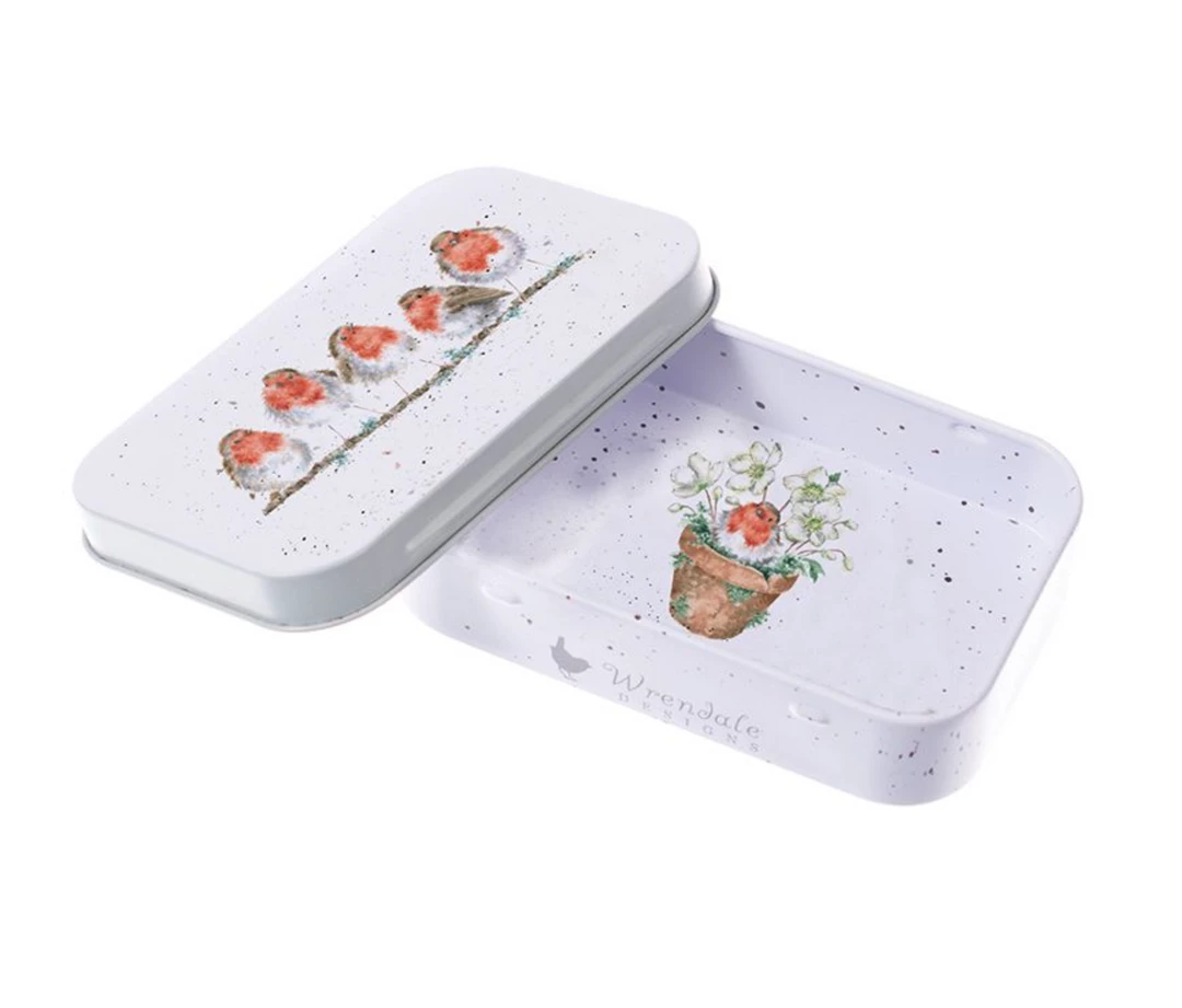 Perfect for storing trinkets, pills or anything small, this mini tin features an adorable robin design.